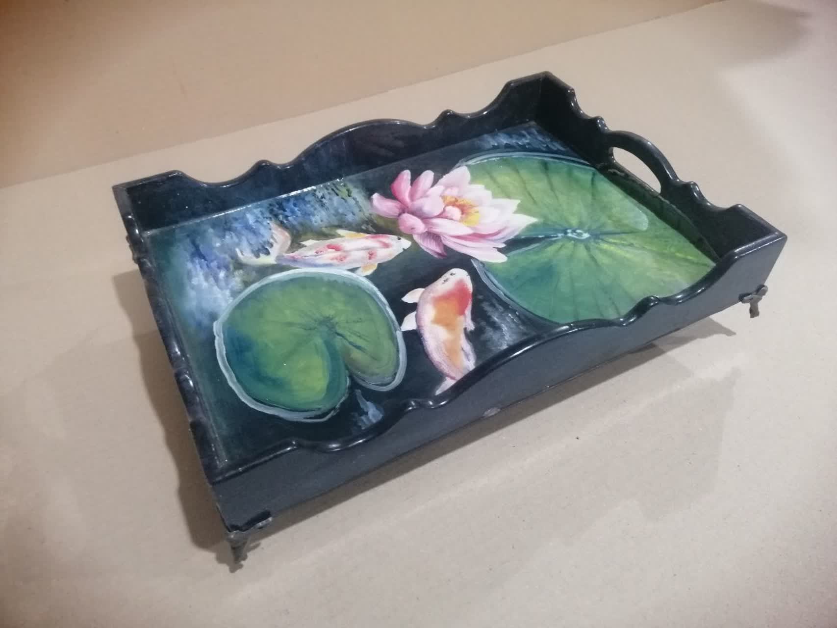 این سینی هنر نقاشی با دست بوده و روکش نهائی پلی استر و ضد آب می باشد. استفاده به عنوان دکور و نیز استفاده بر روی میز به عنوان ظرف میوه و خوراکی و همچنین سینی مناسبی برای سرو چایی میباشد.