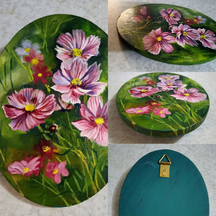 تابلوی دیوارکوب «گلهای بهاری» اندازهٔ تابلو: ۱۶ سانتیمتر طول و عرض آن ۱۲ سانتیمتر تکنیک رنگوروغن بر روی امدیاف ضد آبشده با پلیاستر دارای گیرهٔ آویز در پشت تابلو